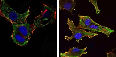 Immunofluorescence analysis of NTERA-2 cells (left) and U251 (right) cells using KLHL13 mouse mAb (green). Blue: DRAQ5 fluorescent DNA dye. Red: Actin filaments have been labeled with Alexa Fluor-555 phalloidin.
