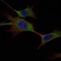 Immunofluorescence analysis of NIH/3T3 cells using HK1 mouse mAb (green). Blue: DRAQ5 fluorescent DNA dye. Red: Actin filaments have been labeled with Alexa Fluor-555 phalloidin.