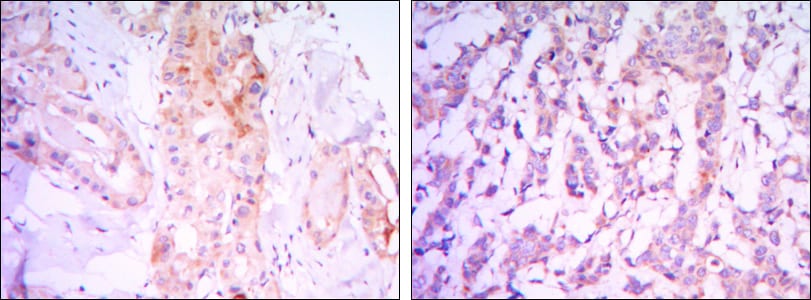 Immunohistochemical analysis of paraffin-embedded human thyroid gland tissues (left) and human breast carcinoma (right) using RICTOR mouse mAb with DAB staining.