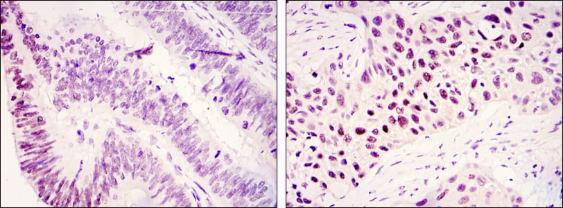 Immunohistochemical analysis of paraffin-embedded human colonic cancer tissues (left) and lung cancer tissues (right) using KDM3A mouse mAb with DAB staining.