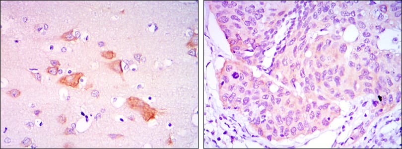 Immunohistochemical analysis of paraffin-embedded human brain tissues (left) and lung cancer tissues (right) using SMAD5 mouse mAb with DAB staining.
