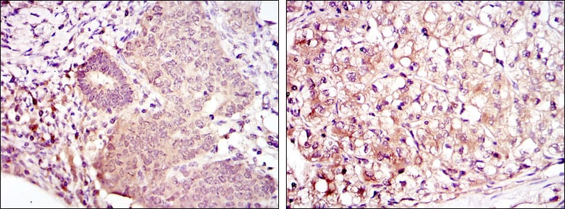 Immunohistochemical analysis of paraffin-embedded human ovarian cancer (left) and kidney cancer (right) using MAP2K6 mouse mAb with DAB staining.