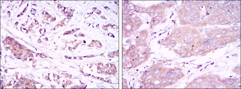 Immunohistochemical analysis of paraffin-embedded human breast cancer tissues (left) and liver cancer tissues (right) using BECN1 mouse mAb with DAB staining.
