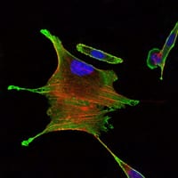 Immunofluorescence analysis of Eca109 cells using BMPR2 mouse mAb (green). Blue: DRAQ5 fluorescent DNA dye. Red: Actin filaments have been labeled with Alexa Fluor-555 phalloidin.
