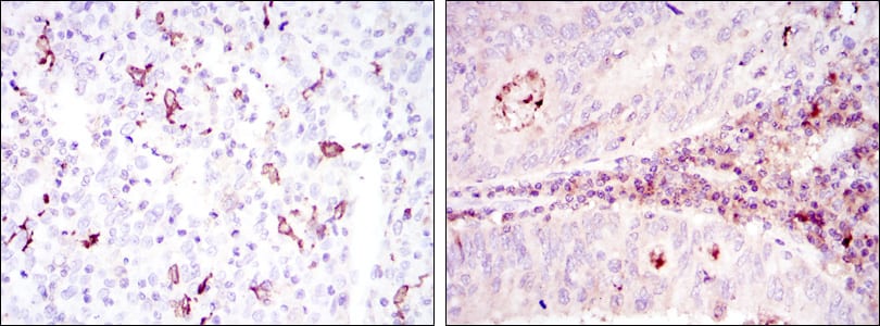 Immunohistochemical analysis of paraffin-embedded human cervical cancer tissues (left) and colon cancer tissues (right) using CD1A mouse mAb with DAB staining.