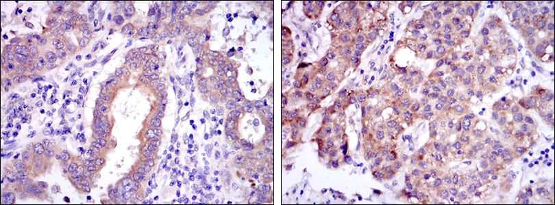 Immunohistochemical analysis of paraffin-embedded human endometrial cancer tissues (left) and liver cancer tissues (right) using c-Rel mouse mAb with DAB staining.
