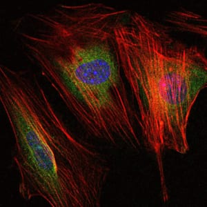 Immunofluorescence analysis of NIH/3T3 cells using MMP9 mouse mAb (green). Blue: DRAQ5 fluorescent DNA dye. Red: Actin filaments have been labeled with Alexa Fluor-555 phalloidin.
