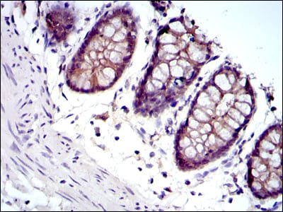 Immunohistochemical analysis of paraffin-embedded human rectum tissues using JUP mouse mAb with DAB staining.