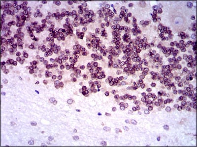 Immunohistochemical analysis of paraffin-embedded human cerebellum tissues using NR6A1 mouse mAb with DAB staining.