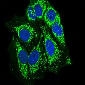 Immunofluorescence analysis of HeLa cells using PTPN11 mouse mAb (green). Blue: DRAQ5 fluorescent DNA dye.