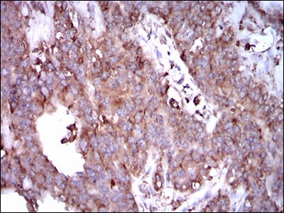 Immunohistochemical analysis of paraffin-embedded human ovarian cancer tissues using STAT5A mouse mAb with DAB staining.