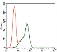 Flow cytometric analysis of K562 cells using STAT5A mouse mAb (green) and negative control (red).