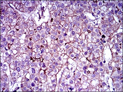 Immunohistochemical analysis of paraffin-embedded human liver cancer tissues using ABCB5 mouse mAb with DAB staining.