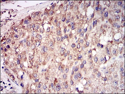 Immunohistochemical analysis of paraffin-embedded human liver cancer tissues using ACP5 mouse mAb with DAB staining.