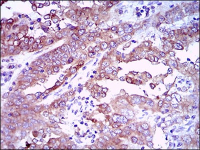 Immunohistochemical analysis of paraffin-embedded human endometrial cancer tissues using EGFR mouse mAb with DAB staining.