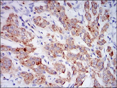Immunohistochemical analysis of paraffin-embedded human prostate cancer tissues using CD10 mouse mAb with DAB staining.