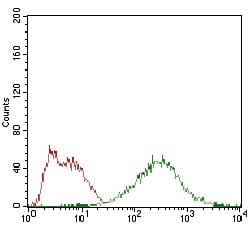 Flow cytometric analysis of HepG2 cells using EIF2A mouse mAb (green) and negative control (red).