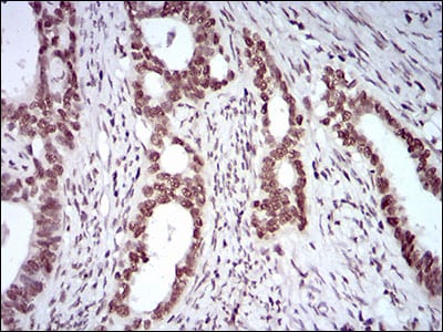 Immunohistochemical analysis of paraffin-embedded human cervical cancer tissues using KHDRBS2 mouse mAb with DAB staining.