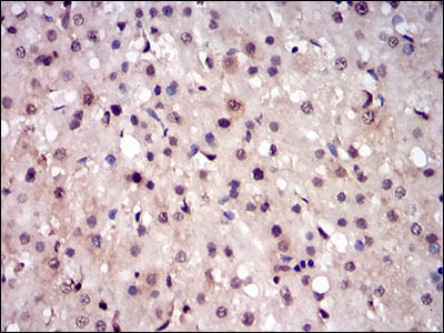 Immunohistochemical analysis of paraffin-embedded human liver tissues using PPP1CB mouse mAb with DAB staining.