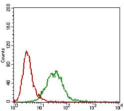 Flow cytometric analysis of Hela cells using CTNNBL1 mouse mAb (green) and negative control (red).
