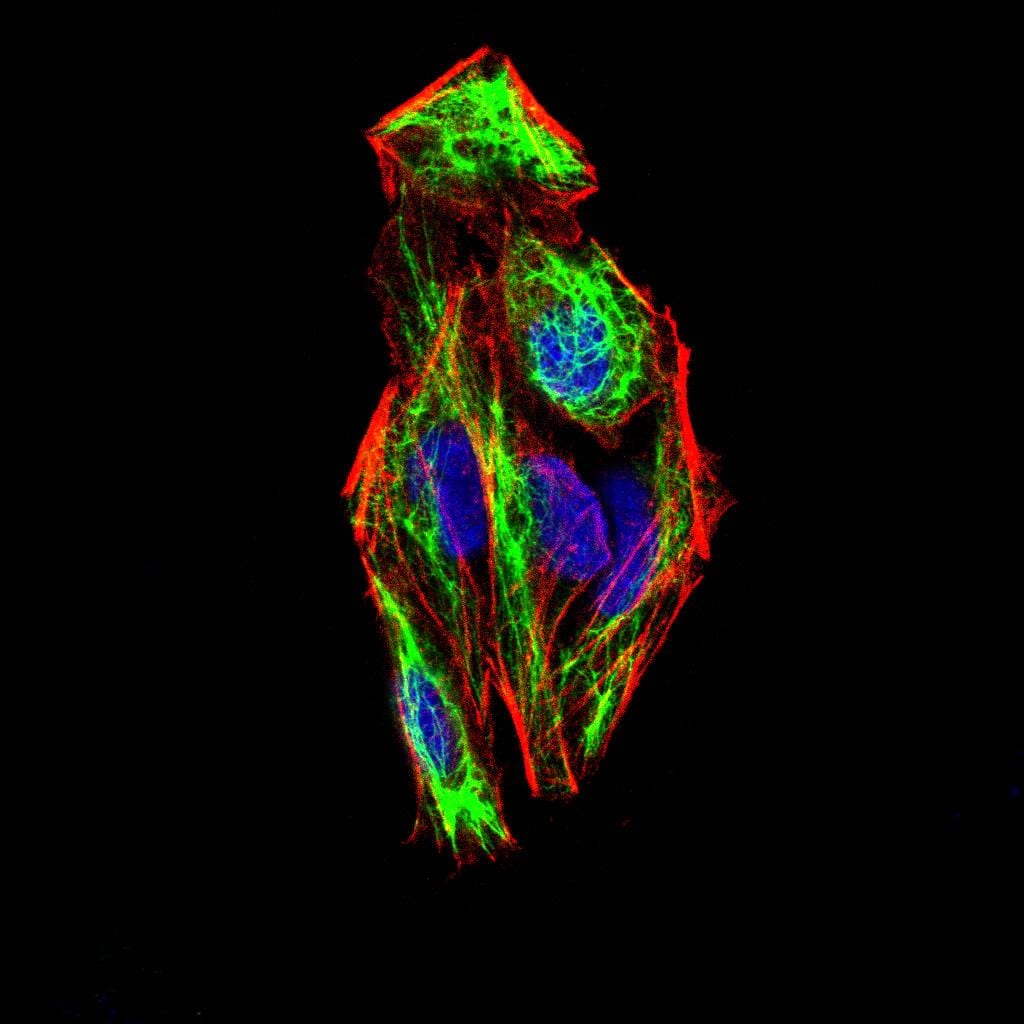 Immunofluorescence analysis of Hela cells using SNAI2 mouse mAb (green). Blue: DRAQ5 fluorescent DNA dye. Red: Actin filaments have been labeled with Alexa Fluor- 555 phalloidin. Secondary antibody from Fisher (Cat#: 35503)