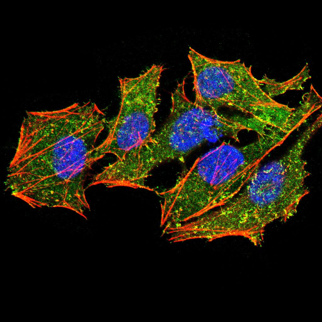 Immunofluorescence analysis of Hela cells using EZR mouse mAb (green). Blue: DRAQ5 fluorescent DNA dye. Red: Actin filaments have been labeled with Alexa Fluor- 555 phalloidin. Secondary antibody from Fisher (Cat#: 35503)