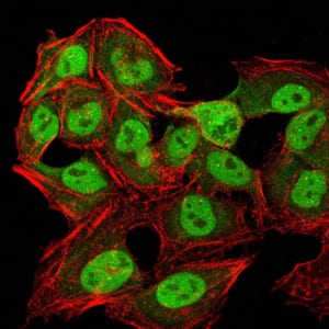 Immunofluorescence analysis of Hela cells using CBX1 mouse mAb (green). Blue: DRAQ5 fluorescent DNA dye. Red: Actin filaments have been labeled with Alexa Fluor- 555 phalloidin. Secondary antibody from Fisher (Cat#: 35503)