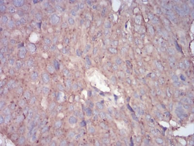 Immunohistochemical analysis of paraffin-embedded human ovarian cancer tissues using RALA mouse mAb with DAB staining.