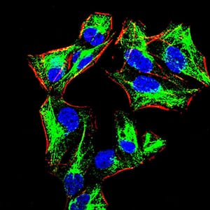 Immunofluorescence analysis of HeLa cells using PRDM1 mouse mAb (green). Blue: DRAQ5 fluorescent DNA dye. Red: Actin filaments have been labeled with Alexa Fluor- 555 phalloidin. Secondary antibody from Fisher (Cat#: 35503)