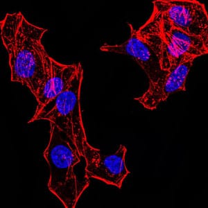 Immunofluorescence analysis of HeLa cells. Blue: DRAQ5 fluorescent DNA dye. Red: Actin filaments have been labeled with Alexa Fluor- 555 phalloidin.