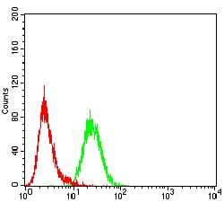 Flow cytometric analysis of Hela cells using Rab5a mouse mAb (green) and negative control (red).
