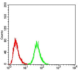Flow cytometric analysis of Hela cells using DDX3X mouse mAb (green) and negative control (red).
