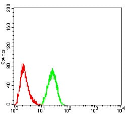 Flow cytometric analysis of Hela cells using KDM1A mouse mAb (green) and negative control (red).