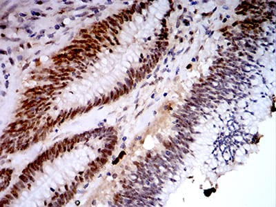 Immunohistochemical analysis of paraffin-embedded human colon cancer tissues using KDM1A mouse mAb with DAB staining.