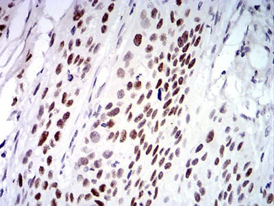 Immunohistochemical analysis of paraffin-embedded human esophageal cancer tissues using UFD1L mouse mAb with DAB staining.
