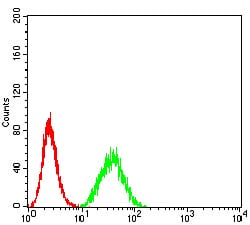 Flow cytometric analysis of Hela cells using DDX1 mouse mAb (green) and negative control (red).
