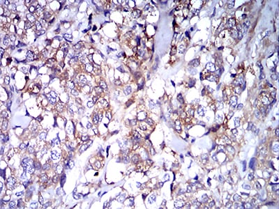 Immunohistochemical analysis of paraffin-embedded human breast cancer tissues using IghA1 mouse mAb with DAB staining.