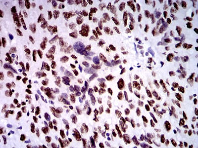 Immunohistochemical analysis of paraffin-embedded human ovarian cancer tissues using ZFP91 mouse mAb with DAB staining.