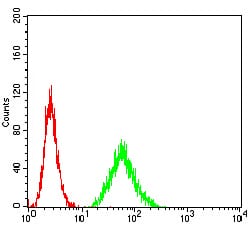 Flow cytometric analysis of MCF-7 cells using HLA-B mouse mAb (green) and negative control (red).