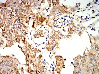 Immunohistochemical analysis of paraffin-embedded human lung cancer tissues using KRT10 mouse mAb with DAB staining.