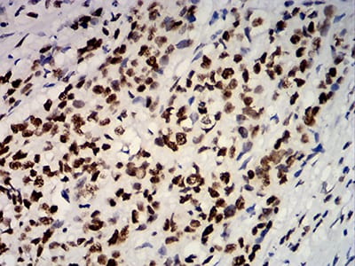 Immunohistochemical analysis of paraffin-embedded human breast cancer tissues using ESR1 mouse mAb with DAB staining.