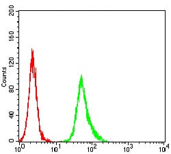 Flow cytometric analysis of Hela cells using ESR1 mouse mAb (green) and negative control (red).