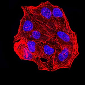 Immunofluorescence analysis of Hela cells using ESR1 mouse mAb. Blue: DRAQ5 fluorescent DNA dye. Red: Actin filaments have been labeled with Alexa Fluor- 555 phalloidin.
