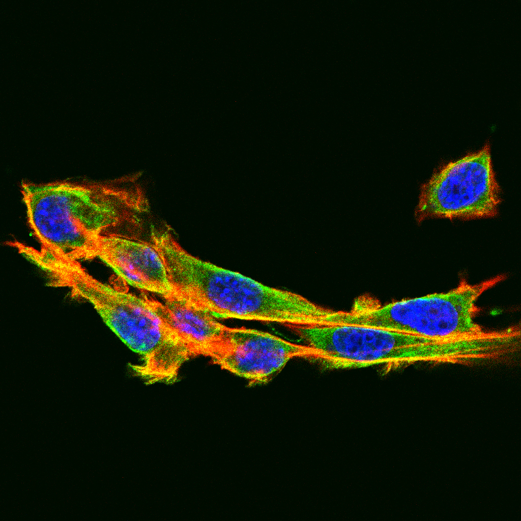 Immunofluorescence analysis of NIH/3T3 cells using PRKAA2 mouse mAb (green). Blue: DRAQ5 fluorescent DNA dye. Red: Actin filaments have been labeled with Alexa Fluor- 555 phalloidin.