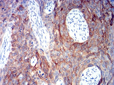Immunohistochemical analysis of paraffin-embedded human cervical cancer tissues using ALDH1A1 mouse mAb with DAB staining.