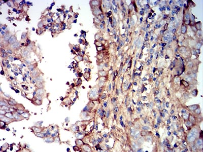 Immunohistochemical analysis of paraffin-embedded human endometrial cancer tissues using IGHM mouse mAb with DAB staining.