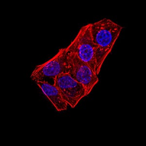 Immunofluorescence analysis of Hela cells using ATG5 mouse mAb. Blue: DRAQ5 fluorescent DNA dye. Red: Actin filaments have been labeled with Alexa Fluor- 555 phalloidin.