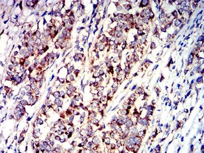 Immunohistochemical analysis of paraffin-embedded human bladder cancer tissues using P2RY1 mouse mAb with DAB staining.