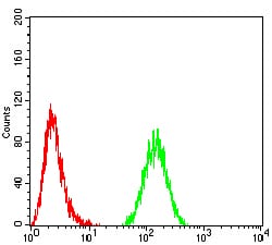 Flow cytometric analysis of Hela cells using TBP mouse mAb (green) and negative control (red).