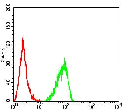 Flow cytometric analysis of Hela cells using RBBP7 mouse mAb (green) and negative control (red).